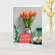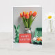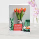 Diese Grußkarte zeigt eine Frühlings-Tischszene vor einem hellen weißen Hintergrund, arrangiert mit einem ruhigen, beieinander liegenden Gefühl, wie Freunde, die sich für ein Foto zusammenlehnen. Links sitzt ein glänzender grüner Keramik-Hase mit aufgerichteten Ohren und entspanntem Gesicht 🐰. Daneben steht eine rote Karte aufrecht mit einer kurzen Osterbotschaft, zentriert in kleinen weißen Buchstaben, die den Blick wie eine stille Notiz zwischen Lieben auf sich ziehen. Dahinter erhebt sich ein Tulpenstrauß aus einer gerillten silbernen Vase, dessen Blütenblätter von Orange zu sanftem Gelb und grünen Stielen übergehen und den Raum mit frischer Farbe füllen 🌷. Rechts hält eine hellgrüne Schachtel dekorierte Eier, gemischt mit schwarzen Punkten, orangen Flecken und einfachen Streifen, die sorgfältig ausgewählt wirken und nicht übereilt. Sanftes, diffuses Licht glättet die Oberflächen und fügt sanfte Highlights auf der Keramik, der Vase und