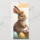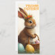 Ein niedlicher Osterhase mit einer Blumenkrone sitzt liebevoll inmitten von Ostereier. In seinem Pfoten tragend ein Klein Weidenkörchen mit bemalten Eiern. Die Szene ist von zarten Frühlingsblumen und warm em Licht umgeben. Über dem Hasen leufrisiert fröhorange Aufschrift "Frohe Ostern"- ein herzlicher Gruß, der die Leichtigkeit und Freude des Frühlingsfestes.