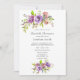 Lila und rosafarbene Rosen und Bäuche blumige Einladungen mit Akzenten von Korallen, Pflaume und Salbei grün.