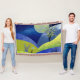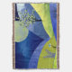 Eine abstrakte Landschaft, die sanfte Hügel mit blühendem Frühlingsbaum und blühenden Pflanze und einem Mond und Sternen in Blau, Zyan, Gelb und Rosa darstellt.