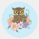 Niedliche kleine braune Eule, die zwischen pastellrosa, pfirsichfarbenen und lila Frühlingsblumen vor hellblauer Kulisse sitzt