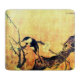 Elegantes, skurriles, farbenfrohes Blumendesign mit einem niedlichen Federvogel an den Zweigen eines blühenden Baumes, Blüten, Blüten in gelben, braunen, weißen Farbtönen, die mit digitaler Wiedererarbeitung einer antiken orientalischen Miniatur geschaffen wurden.