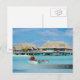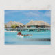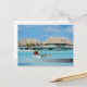 Postkarte von zwei Männern in einem Kanu, die das Frühstück im polynesischen Stil für die Hochzeitsgäste in einem luxuriösen Badeort auf der tropischen, pazifischen Insel Bora Bora, Französisch-Polynesien mit einer verblassenden Bar und dem Text bringt: 'Bora Bora'.
