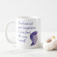 Führe mich nicht in Versuchung. Ich kann selbst den Weg finden. Sarcastic Zitat auf einer lustigen Kaffee-Tasse, mit einer Retro-Lady und ihrem wissenden Lächeln. Der Text befindet sich in einem hübschen Skript, das mit dem blauen Farbton der Abbildung übereinstimmt. Warum nicht ein Geschenk für deine Mutter, Tante, Schwester oder Freundin machen?