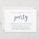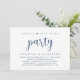 Carte d'invitation de fuite de mariage à thème de script bleu marine moderne (Fête du bonheur éternel). Elle est parfaite pour votre réception de mariage / fête de célébration après le mariage. Ajoutez vos détails dans une police / lettrage noir assorti.
