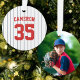 Baseball jersey stripes style ornament with colors that are fully customizable on the front and you can add your photo on the back. On the front, to change the background color, click customize and change the background color and to change the stripes color, click customize, select "ThinStripes1" layer and change the fill color. Perfect for the baseball fan this holiday season.
