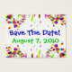 Des points et des tourbillons vifs et colorés qui éclatent à chaque allure avec "Save The Date! et la date au milieu fait que c'est une carte amusante et unique. Personnalisez cette carte d'invitation colorée et festive avec la date de la fête et mettez vos informations personnalisées sur le dos, ou vous pouvez même supprimer le texte si vous ne le voulez pas. Idéal aussi pour les étiquettes de nom, badges, étiquettes cadeaux, signets, étiquettes, cartes de table, fêtes d'anniversaire, réunions, fêtes d'entreprise, cartes de remerciement, et chaque fois que vous avez besoin d'une carte personnalisée colorée, joyeuse et captivante. Montré est la carte taille chubby. Deux autres tailles sont disponibles. Préparez-vous pour le plaisir !