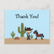La carte postale de remerciement de ce garçon a un thème occidental cowboy. Il y a un cowboy portant un casquette, des bottes et une étoile du shérif debout à côté de son cheval. Il y a des cactus dans l'arrière - plan. Vous pouvez facilement customiser votre message de remerciement au dos. Copyright © Tainted Sweets com com