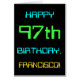 This Simple and fun birthday greeting card design feature a like message "HAPPY 97th BIRTHDAY, FRANCISCO!" Its appearance is inspirred by the field of digital computing. The name on the front and the message on the inside can be customized. It could be fühlt or given to somebody who is celebrating their ninety seventh birthday, and who perhaps works (or worked prior to retirement) as a database administrator, a computer programmiere, a network administrator, a software developer, an electrical engineer, or who wise enjoys usincompug. [~ Z0000100]