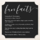 Aktualisieren Sie Ihre Hochzeit Untersetzer mit einer einzigartigen und lustigen Drehung! Personalisieren Sie diese Untersetzer, indem Sie eine Liste von wunderbaren Fakten über Braut und Bräutigam präsentieren. Diese Vorlage fügt nicht nur eine persönliche Touch hinzu, sondern dient auch als fantastischer Eisbrecher, der Gespräche unter Ihren Gästen auslöst. Das Design behalte es einfach und dennoch modern, mit Schriftzypografie in Weiß vor einem schwarzen Hintergrund. Diese elegante Kombination verbessert die Ästhetik und macht diese personalisierten Untersetzer zu einer unvergesslichen Ergänzung Ihrer Hochzeitsfeier. Gönnen Sie Ihren Gästen interessante Tipps zu diesem Paar und schaffen Sie eine lebendige Atmosphäre, die den Ton für einen fröhlichen Anlass Set. Lassen Sie Ihre Hochzeitsdetails mit diesen maßgeschneiderten Untersetzer höher, wo Einfachheit und moderner Charme aufeinander treffen. Bitte zögern Sie nicht, mich unter info@lddesignloft.com zu kontaktieren, wenn Sie Hilfe bei dieser Designvorlage benötigen.