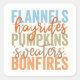 Dieses dynamische und strukturierte Herbstdesign hebt die wesentlichen Elemente der Herbstsaison mit den Worten "Flannels", "Hayrides", "Pumpkins", "Sweaters" und "Bonfire" hervor. Jedes Wort wird in fett gedruckten Großbuchstaben mit einer verwitterten Textur angezeigt, die dem Design ein rustikales, Vintages Gefühl verleiht. Die Farbpalette umfasst coole Blues, warme Orangen, erdige Grüntöne und weiche Braun, die die verschiedenen Farbtöne des Herbstes einfangen. Die Wörter "Hyrides" und "Sweaters" sind in einem fließenden, kursiven Drehbuch geschrieben, das wunderbar mit dem Blocktext kontrastiert und dem Design eine Touch von Eleganz und Bewegung hinzufügt. Kleine Sterne-Akzente sind um den Text verstreut und verleihen dem Text einen zusätzlichen Charme und Spielfreude.