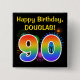This fun, vibrant button design features a colorful bursting celebratory fireworks inspired pattern, along with the number "90" having a multicolored rainbow like spectrum or gradient pattern. It also features a custom name and event message, such as a "Happy Birthday" birthday greeting. A button like this might be worn by the attendees at a birthday party being held in celebration of somebody’s ninetieth birthday. [~Z0000334]