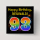 This fun, vibrant button design features a colorful bursting celebratory fireworks inspired pattern, along with the number "93" having a multicolored rainbow like spectrum or gradient pattern. It also features a personalized name and event message, such as a "Happy Birthday" birthday greeting. A button like this might be worn by the guests at a birthday party being held in celebration of somebody’s ninety third birthday. [~Z0000334]