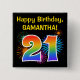 Dieses lustige, lebendige Knopfdesign zeichnet sich durch ein farbenprächtiges, aufstechendes, feierliches Feuerwerk aus, das mit der Zahl "21" inspiriert ist, die ein buntes, von Regenbogen inspiriert Spektrum oder ein Farbverlauf aufweist. Es enthält auch einen anpassbaren Namen und eine Veranstaltungsnachricht, wie zum Beispiel einen Geburtstagsgruß von "Happy Birthday". Ein solcher Knopf könnte von den Gästen bei einer Geburtstagsparty getragen werden, die zur Feier des 21. Geburtstages von jemandem veranstaltet wird. [~Z0000334]
