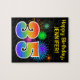 Dieses lustige, lebendige Puzzle-Design zeichnet sich durch ein farbenfrohes, von feierlichen Feuerwerken inspiriertes Muster aus, zusammen mit der Zahl "35" mit einem bunten Regenbogen-inspirierten Farbverlaufsmuster auf schwarzem Hintergrund. Es enthält auch einen anpassbaren Namen und eine Ereignismeldung, wie z. B. einen Geburtstagsgruß. Ein Rätsel wie dieses könnte eine lustige Art sein, eine Geburtstagsbotschaft zu senden, um jemandes fünfunddreißigsten Geburtstag zu würdigen. [~Z0000329]