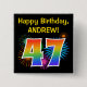 Dieses lustige, lebendige Knopfdesign zeichnet sich durch ein farbenprächtiges Muster aus, das durch das Bersten von feierlichen Feuerwerken inspiriert wird, sowie durch die Zahl "47" mit einem farbenfrohen Regenbogen-inspiriert Spektrum oder Gradientenmuster. Es enthält auch eine individuelle Name- und Veranstaltungsnachricht, wie zum Beispiel den Geburtstagsgruß "Happy Birthday". Ein solcher Knopf könnte von den Teilnehmern einer Geburtstagsparty getragen werden, die zur Feier des siebenundvierzigsten Geburtstages von jemandem veranstaltet wird. [~Z0000334]