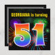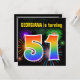 Dieses lustige, lebendige Geburtstagsfeierdesign besticht durch ein farbenprächtiges, stürmisches, feierliches Feuerwerk, das inspirierte Muster, zusammen mit der Zahl "51", die ein buntes Regenbogenmuster wie Spektrum oder Farbverlauf aufweist. Der Name auf der Vorderseite kann personalisiert sein. Auf der Rückseite finden Sie personalisierte Details zum Party. Geburtstagsfeierlichkeiten wie diese werden vielleicht geschickt, um Gäste zu einer Geburtstagsparty einzuladen, die zum Feiern des 50. Geburtstages von jemandem veranstaltet wird. [~Z0000337]