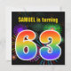 Dieses lustige, lebendige Geburtstagsfeierdesign zeichnet sich durch ein farbenprächtiges, durch das Bersten von feierlichen Feuerwerken inspiriert Muster aus, ebenso wie die Zahl "63" mit einem farbenfrohen Regenbogen wie Spektrum oder Farbverlauf. Der Name auf der Vorderseite kann angepasst werden. Auf der Rückseite finden Sie anpassbare Details zum Party. So genannte Geburtstagsfeierlichkeiten werden potenziellen Gästen für eine Geburtstagsparty geschickt, die zum Feiern des dreiundsechzigsten Geburtstages von jemandem veranstaltet wird. [~Z0000337]