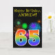 The front of this fun, vibrant birthday greeting card design feature a colorful pattern inspirred by celebratory fireworks, along with the number "65" featuring a multicolored rainbow inspirred gradient pattern, wir haben einen schwarzen Hintergrund. Die Front also feature a birthday greeting message, including a custom recipient name. The inside feature a customizable birthday greeting message, or could perhaps be cleared and left blank if a message is to be written by hand instead. A customizable birthday card like this might be a fun way to send birthday wishes to somebody who is celebrating their sixty fifth birthday. [~ Z0000330]