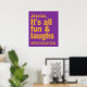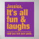 "It's all fun & laughs until you wet your pants". Change the text field to what you want. You can also change the font and its size and color by using the "Customize it" function, as well as add more text fields if you wish. Further, you can change the background color of this item to whatever color you want. See my store for more items with this design.