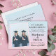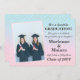 Es ist ein doppelter Abschluss. Spaß und moderne Zwillinge Foto High School Abschluss Einladung mit einem goldenen, blauen und rosa ombre Muster Hintergrund. Personalisieren Sie den Text, um stolz den Abschluss Ihrer Töchter und ihres Jahrgangs bekannt zu geben und laden Sie Ihre Gäste zu einem offenen Haus oder Party ein.