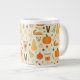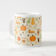 Dieses Design zeigt ein reizvolles fallthematisches Muster mit gemütlichen Herbstelementen. Das Design umfasst Abbildungen von Kürbissen, Kürbiskuchenscheiben, überzogen mit Sahne, warme Herbstgetränke in Go-Bechern und Butternut Squash. Dazwischen gibt es Zimt, Sternanis, Grünpflanzen, Herbstblätter, Eicheln und kleine Beeren, alles Set mit einem weichen Cremeuntergrund. Das Muster strahlt eine warme und einladende Atmosphäre aus, perfekt um die Aromen und Farben der Herbstsaison zu feiern.