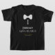 Ces t-shirts amusants sont conçus comme des faveurs ou des cadeaux pour les porteurs de bague mariages. Le t-shirt est noir et présente l'image d'une cravate arc blanche et trois boutons. Le texte indique Ring Bearer, et a un endroit pour entrer son nom ainsi que le nom du couple mariage et la date du mariage. Grand ajout à un sac de bagage mariage.