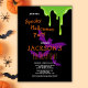 Suchen Sie eine lustige, lustige Halloween Geburtstagsfeier, die Ihren Gästen Gänsehaut geben wird? Schauen Sie nur auf diese schwarze Einladung mit grünen Schleimen und lila Fledermäusen im schwarzen Hintergrund. Verwenden Sie die Entwurfswerkzeuge, um Text, Schriftart und Farben zu personalisieren. Auch als digitaler Download verfügbar.