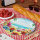 Diese Papiertafel ist ein lustiges Design für den Sommer mit einer Strandszene mit Blume, Schmetterlingen, Palmen und Strand und Ozean im Hintergrund. Dies wäre ideal für jedes Party oder Picknick im Sommer.