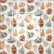 Dieses Design zeichnet sich durch ein reizvolles Wasserfarbenmuster aus Kürbissen und Jack-o'-Laternen in einer sanften, gedämpften Farbpalette aus. Das Design umfasst verschiedene Kürbisformen und -größen, die in sanften Orange-, Creme- und Grautönen gestrichen sind. Jeder Jack-o'-Laterne hat ein einzigartiges, gemeißeltes Gesicht, das von fröhlich und freundlich bis leicht spöttisch reicht und dem Muster Charakter und Abwechslung verleiht. Die Kürbis sind auf einem sauberen, weißen Hintergrund angeordnet, wodurch sich die zarten Aquarelltexturen herausstellen können. Das Gesamtdesign ist festlich und ansprechend, ideal, um den skurrilen Geist von Halloween auf gemütliche, künstlerische Weise zu erfassen.
