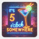 Helles und farbenfrohes Neonschild mit dem Text "Five 'O Clock Somewhere" neben einem lebendigen Cocktailglas an einer Backsteinwand