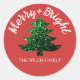 Funkelnd frohe Weihnachtsbaum grün rot Aufkleber. Geschenkartikel mit funkelnd Weihnachtsbaum und Typografie Merry + Bright. Foto der Glitzern, nicht der eigentliche Glitzer.