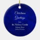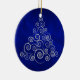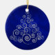 Glittery silber Wirbel werden in diesem Design verwendet, um ein hübsches Weihnachtsbaumbild zu machen. Das Bild wird auf einem lebhaften royal blauen Farbverlaufshintergrund platziert. Die Rückseite des Ornaments hat den gleichen blauen Hintergrund, mit vier Textfeldern in Silber für Sie anpassen. Macht ein nettes Geschenk von der Familie.