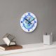 Funky blaue Blumen bedecken den Mittelpunkt dieser nummerierten Wanduhr. Ein passender blauer Rand trennt die Blume vom weißen Zahlenring. Große blaue Zahlen markieren jede Viertelstunde. Die anderen Stunden sind mit etwas kleineren Zahlen in hellblau markiert.