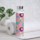Der hellrosa Hintergrund ist mit einem trendigen Muster von Kreisen, Punkten und Ringen in verschiedenen lebhaften Farben, darunter Blau, Grün, lila und Gelb, geschmückt.