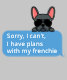 Dieses lustige Sweatshirt mit einem niedlichen blauen, französischen Bulldoggen mit einer Textnachricht, die lautet: "Tut mir leid, ich kann nicht, ich habe Pläne mit meinem Franzosen." Dieses niedliche Sweatshirt ist auch mit verschiedenen bunten französischen Bullhunden in männlicher und weiblicher Ausführung erhältlich.