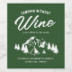 humorvolle Camping-Bachelorette-Weinflaschen-Etiketten mit einem zeichn eines Campingplatzes mit Bergen, Bäumen, einem Holzfeuer, einem Zelt, dem witzigen Sprichwort "Camping ohne Wein, sitzt nur im Wald" und einer bearbeitbaren Textvorlage.