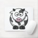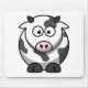 Niedliche, schwarz-weiße Cartoon Kuh. Die Kuh mit ihren großen Augen, dem gepunkteten, runden Körper, den lustigen schwarzen Füßen und der rosa Nase.
