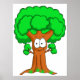 Niedlicher, lustiger Cartoon-Baum mit grünen Blätter, brauner Kofferraum, ein fröhliches Lächeln und große runde Augen.