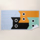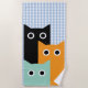 Das Strandtuch mit drei lustigen Katzen. Einer ist schwarz, der links ist orange, etwas niedriger und rechts von der schwarzen Katze, etwas vorne und eine ist aquamarin, niedriger als die anderen beiden Katzen und vor ihnen stehend. Die einzige Eigenschaft auf den Katzen sind große runde Augen. Der Hintergrund des Handtuchs ist ein niedliches pastellblaues Gingham-Muster.