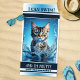 Strandtuch mit niedlichem Kätzchen im Wasser, das zum Schwimmen einlädt. Der Hintergrund ist ein marineblau gestreiftes Design. Ideal für den Pool oder den Strand.