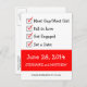 Diese lustige "Rett-the-Date"-Postkarte enthält eine Checkliste wichtiger Ereignisse, die zum großen Tag führen. Text ist schwarz auf weiß und weiß auf rot. Alternative Version in Rosa und Blau: