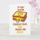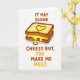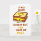 This cute greeting card features an illustration of a grilled cheese sandwich centered on a plain white background. The bread is toasted golden-brown, and the bright yellow cheese in the middle is melted and dripping down the sides. A small yellow heart sits on the top slice, tying the whole idea to love and affection. Beneath and around the sandwich, the card reads, “IT MAY SOUND CHEESY BUT, YOU MAKE ME MELT.” The text is in easy-to-read block letters, and the words “YOU” and “MELT” stand out in a warm golden color. A soft shadow under the sandwich adds a little depth while keeping the focus on the sweet, funny message. It’s a light, romantic way to say someone has your heart ❤️❤️❤️