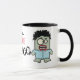 Diese Tasse wird ein Lächeln bringen. Das Bild ist von einem Cartoon Zombie mit verrückten Augen und einem Mund tropfendes Blut. Der Text in der Mitte in rot und schwarz sagt: "Brauche mehr Kaffee." Das Zombie-Bild wird auf zwei Seiten gedruckt. Niedlich!