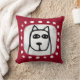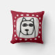 Ein niedlich gezeichnet Hund in Schwarz-Weiß auf einem rot strukturierten Hintergrund, umgeben von weißen Punkten.