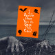 Die lustige Halloween-Karte zeigt vier schwarze Silhouette-Icons eines beängstigenden Schlägers, Geisters, Baumstumpf und Schädels mit den Worten "Ich wage es, diese Karte zu öffnen" in einem bedrückten, spöttischen, weißen Schriftart. Die Hintergrundfarbe ist orange. Du musst die Karte öffnen, um zu sehen, was drin ist. Ein lustiger, neuartiger Weg, einem Freund oder Verwandten einen glücklichen Halloween-Urlaub zu wünschen und Hallo zu sagen.