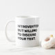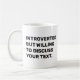 Markieren Sie Ihre Persönlichkeit mit dieser individuell gestaltbaren Coffee Tasse mit dem witzigen Satz "Introverted but Willing To Discuss", gefolgt von Ihrem eigenen Text. Ob Bücher, Kaffee, Reisen oder irgendein sonderbares Interesse, Sie können das Thema auswählen, das Sie bestimmt. Sie können Ihren eigenen Namen für eine persönliche Touch hinzufügen. Diese humorvolle Kaffeemaschine ist ein großartiges Geschenk für Introvertierte mit einem Sinn für Spaß. Verwenden Sie das Entwurfswerkzeug, um die Textfarbe zu ändern, falls Sie möchten, und wählen Sie die Schriftgröße und den Stil der Tasse aus dem Menü.