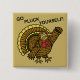 Dieses humorvolle Erntedank-Truthahn-Design zeigt einen zornigen Cartoon-Truthahn, der eine geflügelte Faust mit einem Zahnseide windet: Sprichwort "Geh und spucke dich selbst!" Es ist ein lustiger Truthahn-Knopf, um Ihren Erntedank-Dinner am Türkei-Tag zu tragen.