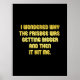 Fett gelber Text auf schwarzem Hintergrund präsentiert einen humorvollen Wortgefecht über einen frisbee, der größer wird und dann jemanden trifft. Das einfache Design betont die Pointe des Witzes.