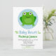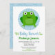 Diese Jungs Baby Dusche Einladung mit einem lustigen grünen Frosch mit großen Augen auf einem blauen Wendelhintergrund.
